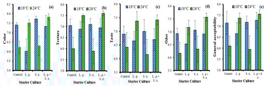 The effects of the interactions of ripening rate × starter culture on color (a); texture (b), taste (c); odor (d); and general acceptability (e) of sucuk.