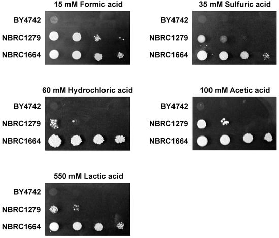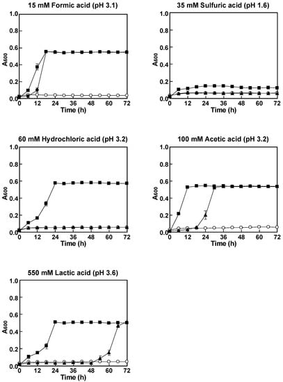 | Yeast | 15 mM Formic Acid | 35 mM Sulfuric Acid | 60 mM Hydrochloric Acid | 100 mM Acetic Acid | 550 mM Lactic Acid |