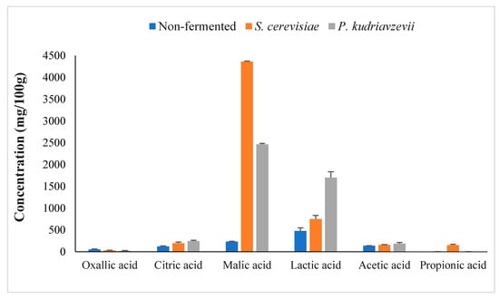 Concentrations of organic acids (mg/100 g) in nonfermented (control) and fermented date pulp residues by S. cerevisiae and P. kudriavzevii. Values are the mean values (n = 3). Error bars express standard deviations.