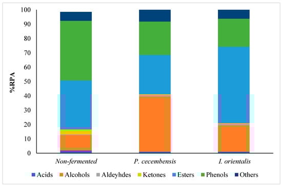 Although the influence of yeast fermentation on the volatile profiles has been extensively studied in different food products, especially wine [54,55,56], there is still a need to understand the effect of selective yeast fermentation on the volatiles of date pulp residue (DPR). Figure 2 shows the chemical categories of volatile compounds that were detected in both fermented and nonfermented DPR. In total, 42 volatile compounds were identified, including 10 volatile acids, 8 esters, 6 alcohols, 4 phenols, 3 ketones, 4 aldehydes, and 10 compounds belonging to various other chemical groups (Table S1). Figure 2 highlights that when S. cerevisiae and P. kudriavzevii were used to ferment DPR, volatile compounds belonging to the alcohol group were synthesized in higher amounts (~41% and 28% RPA, respectively) compared to the control (~11% RPA). On the other hand, the RPA% of esters decreased by 18% in the samples fermented with S. cerevisiae compared to the control (~30.4%).