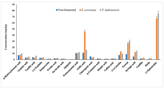 In our work, a total of ~70, 194, and 204 mg/kg of 20 phenols were quantified by the UPLC in nonfermented DPR (control), and fermented DPR by P. kudriavzevii and S. cerevisiae, respectively (Figure 3). In general, yeast fermentation significantly increased the level of phenolic compounds from the byproduct, especially gallic acid, tyrosol, syringic acid, and (-)-epicatechin. Following fermentation, two new flavonoids were detected, namely, apigenin in small quantities and (-)-epicatechin in dominant quantities. UPLC analysis suggests that these two flavonoids might have been synthesized by the yeast strains used in fermenting the date pulp residues.