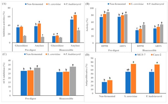The unchanged and upward trends of ACE inhibition and α-amylase/cytotoxicity inhibition activities in the bioaccessible portions of fermented DPR propose a quantitative conservation and/or development in the bioactive compounds responsible for these features throughout the digestion process. The strain S. cerevisiae had a significantly higher α-amylase inhibition than P. kudriavzevii. The relatively high inhibitory effect of α-amylase in our study is in accordance with that found by Barros et al. [77] for a bioaccessible portion of fermented soursop residue by multiple bacterial probiotics.