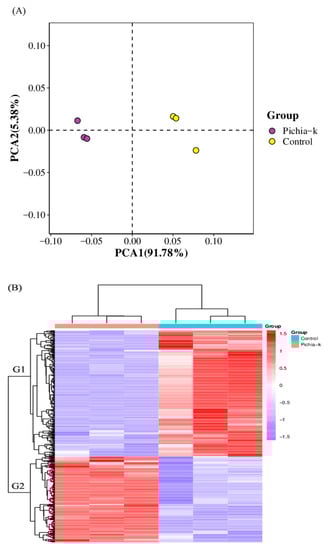 PCA scores (A) compare P. kudriavzevii with control, and heatmap (B) illustrates the metabolite concentration. The colors on the heatmap range from violet to red, and their specific color references are explained in the online version of the article. The cluster analysis in panel (B) presents the expression patterns of the differential metabolites in the two sample groups. Each row in the heatmap denotes a differential metabolite, whereas each column indicates a sample. The color scale spans from violet to red, where violet represents a low expression level, and red reflects a high expression level.