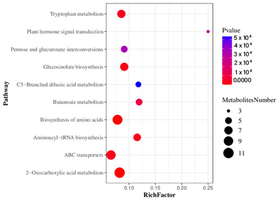 The x-axis shows the RichFactor, representing the proportion of differential metabolites in a pathway relative to all annotated metabolites in the same pathway. The dot size reflects the number of differential metabolites annotated within the pathway. The y-axis represents the name of the KEGG metabolic pathway. A higher RichFactor value indicates a higher ratio of annotated differential metabolites in the pathway. The size and color of the dots reflect the number and level of annotated differential metabolites within the pathway.