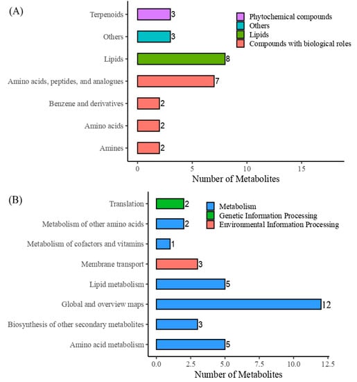 Figure 7 presents the analysis of carbohydrate metabolism (Figure 7A) and the identification of pathways correlated with differentially regulated metabolites using the KEGG database (Figure 7B). In Figure 7A, the differentially regulated metabolites between the P. kudriavzevii sample and the control were classified into lipids, compounds with biological roles, phytochemical compounds, and others that remained uncategorized. The most significant categories of differential metabolites were lipids (8), followed by amino acids, peptides, and analogues (7), and terpenoids (3). Figure 7B displays the major metabolic pathways of carbohydrate identified through the KEGG database analysis, which include global and overview maps (12), amino acid metabolism (5), lipid metabolism (5), biosynthesis of other secondary metabolites (3), and membrane transport (3).