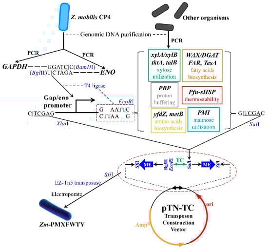 - Zhang, X.; Wang, T.; Zhou, W.; Jia, X.; Wang, H. Use of a Tn5-based transposon system to create a cost-effective Zymomonas mobilis for ethanol production from lignocelluloses. Microb. Cell Fact. 2013, 12, 41. [Google Scholar] [CrossRef]
