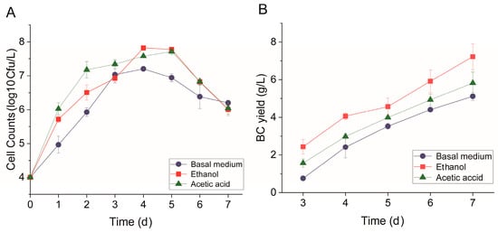 Previously, we found that 1% (v/v) ethanol and 1% (v/v) acetic acid had the most significantly positive effect on BC yield improvement of K. nataicola Y19. As a consequence, 1% (v/v) ethanol and 1% (v/v) acetic acid were chosen as the experimental concentrations in this section. The 2% (v/v) primary inoculum was added to 500 mL flasks containing 100 mL HS medium with 1% (v/v) ethanol and 1% (v/v) acetic acid, respectively, and then cultivated at 30 °C for 7 d. Fermentation in the HS medium was set as the control. The harvested BC membrane was purified by distilled water and then treated with 0.5 M NaOH at 90 °C for 24 h. After that, BC was washed with distilled water to eliminate embedded cell debris and impurities. The BC yield was obtained according to Ryngajłło’s research [], with appropriate modifications. The purified BC membranes were subsequently dried at 105 °C until they achieved a constant weight, before being weighed. The viable cell number was determined using the plate dilution method []. First, the broth containing the BC membrane was treated with cellulase (10 kU/g Jinggang ShangTian, Japan) at 37 °C for 3 h to hydrolyze cellulose. Then, the free cell number was determined by counting the colony-forming units. The bacterial suspension containing bacteria was serially diluted with 0.9% saline, and then 100 μL of the bacterial suspension from each serially diluted solution was spread on HS plates. The plates were then incubated at 30 °C, and the colonies formed were counted within 3–4 days. Each bacteria suspension was performed in triplicate. A scanning electron microscope (SEM, Phenom-World BV, Eindhoven, The Netherlands) was used to observe the BC micromorphologies of the experimental group and the control. Before detection, the BC membrane was immersed in liquid nitrogen to maintain the stability of the structure. Then, it was quenched from the middle of the BC membrane, and the quenched sample was taken for vacuum freeze-drying at −80 °C.