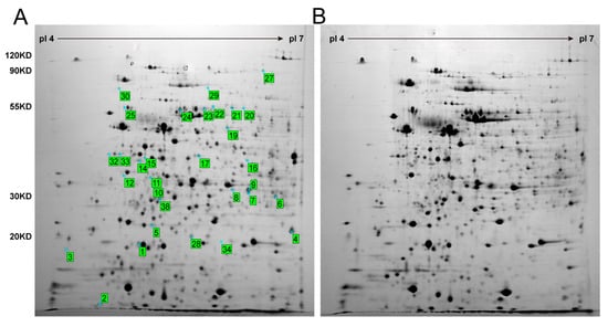 The obtained intracellular proteins of Y19 in each group were separated via two-dimensional electrophoresis, according to Cheng’s study []. Isoelectric focusing (IEF) was performed in IPG strips (pH 4–7, 13 cm, GE Healthcare, Piscataway, NJ, USA) on a Multiphor III; system (GE Healthcare, Piscataway, NJ, USA). IPG strips were rehydrated by 250 μL of a rehydration buffer containing 550 μg proteins, 7 M urea, 2 M thiourea, 2% (w/v) CHAPS, 65 mM DTT, 2% (v/v) IPG buffer (pH 4–7, GE Healthcare, Piscataway, NJ, USA) and 0.002% (v/v) bromophenol blue (Beyotime, Shanghai, China). Subsequently, the IPG strips were rehydrated again in 4 mL of immobilized DryStrip cover fluid (Cytiva, Marlborough, MA, USA) at 25 °C for 14 h. The running conditions were as follows: 500 V for 500 Vh, followed by 1000–8000 V for 19,800 Vh, and finally 500 V for 10 h, at 20 °C, 50 μA. For the reduction and alkylation of proteins, the treated IPG strips were equilibrated with an equilibration buffer (150 mM Tris-HCl, 8 M urea, 20% (v/v) glycerol, 2% (w/v) SDS and 100 mM DTT). Then, the IPG strips were equilibrated again with the same buffer after replacing the DTT with 250 mM iodoacetamide (Sigma, Saint Louis, MO, USA). After the reduction and alkylation processes, the strips were loaded onto a slab gel (20 cm × 20 cm × 1 mm) for sodium dodecyl sulfate polyacrylamide gel electrophoresis (SDS-PAGE). The electrophoresis was performed in 4% stacking gel and 12.5% separating gels. The IPG strip gel was enclosed with 0.5% low-melting agarose gels. The SDS-PAGE running buffer contained 3% (w/v) Tris, 1.4% (w/v) glycine and 0.1% (w/v) SDS. The 4% stacking gels and 12.5% separating gels were used with a constant current of 20 mA (600 V, 40 min) and 40 mA (600 V, 5 h), respectively. Finally, the proteins were visualized on gels by Coomassie Brilliant Blue R-250 (Amresco, Solon, OH, USA).