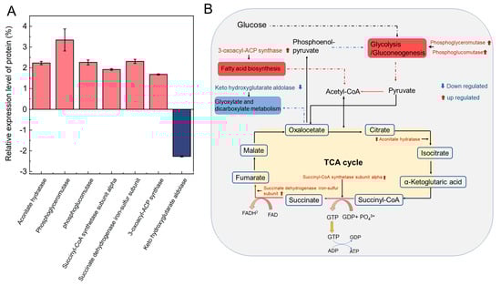 Significantly differentially expressed proteins involved in the TCA cycle in K. nataicola Y19 in the presence of ethanol. (A) Relative expression level of significantly differentially expressed proteins. (B) The distribution of differentially expressed proteins in the TCA cycle. Red: up-regulated proteins; blue: down-regulated proteins.