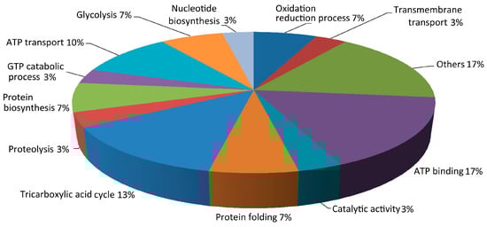 Proteomics research of Y19 was performed after ethanol treatment. Proteomics profiling analysis identified several novel proteins associated with BC biosynthesis, including natively secreted proteins and intracellular proteins. The representative 2D images of the Y19 protein profiles of the control and the ethanol-enhanced group are shown in Figure 2. Proteins with an isoelectric point between pH 4 and 7 and a molecular weight between 10 and 120 kDa were separated, and 847 gel spots were matched across three independent experiments (Supplement Figure S3). Finally, 38 protein spots were differentially expressed in the ethanol group under the standards of ratio > 1.5 and p-value < 0.05. Of these 38 spots, 28 proteins were successfully identified, including 19 with an up-regulated expression and 9 with a down-regulated expression, as summarized in Table 2. After the addition of ethanol, the expression of endoglucanase was decreased by 4.05%, while the expressions of succinyl-CoA synthetase subunit alpha, aconitate hydratase, succinate dehydrogenase iron-sulfur subunit and 3-oxoacyl-ACP synthase in the TCA cycle were increased by 1.92%, 2.23%, 2.31% and 1.68%, respectively (Figure 3). Furthermore, FoF1-ATP synthase subunits (α, β and γ), which are closely related to ATP synthesis, were increased by more than 2.18%. In particular, the elongation factor Tu and translocase subunit SecB were clearly increased by 7.01% and 5.13%, respectively. The biological functions of these proteins were analyzed via clustering analysis, shown in Figure 4. The majority of the differentially expressed proteins were involved in ATP binding, tricarboxylic acid cycle, ATP transport, glycolysis, protein biosynthesis and protein folding. These results indicated that the glucose metabolism and energy cycle were more active after the addition of ethanol.