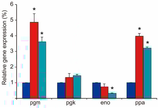 To further investigate the effect of ethanol on the carbon metabolic pathway of K. nataicola Y19, the transcription levels of representative genes, including phosphoglucomutase (pgm), phosphoglycerate kinase (pgk), phosphopyruvate hydratase (eno) and inorganic pyrophosphatase (ppa), were determined. As shown in Figure 5, the expression of pgm was up-regulated 4.87-fold, while the expression of Eno gene was down-regulated 0.75-fold after ethanol addition. The expression of pgk in the presence of ethanol was increased slightly (p < 0.05). The transcription of ppa involved in oxidative phosphorylation was increased 3.97-fold.