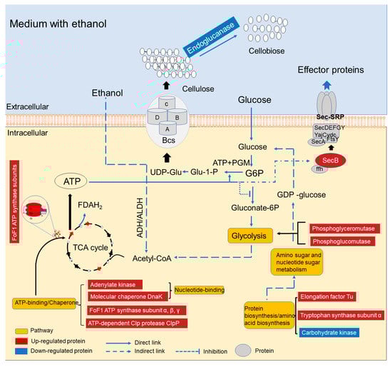 Our results show that ethanol could up-regulate the expression of phosphoglucomutase at both proteomics and transcription levels (Table 2 and Figure 5), which is in accordance with previous observations []. Phosphoglucomutase, a key enzyme closely related to BC synthesis [], catalyzes the conversion of glucose-6-phosphate into glucose-1-phosphate, which is a very important step in BC synthesis []. These results imply that the route leading to cellulose formation was induced and the glucose flux toward glycolysis and the HMP pathway was down-regulated in the presence of ethanol, which is consistent with the results of key enzyme activities in other research []. Glycolysis is an oxygen-independent metabolic pathway that regulates the initial stages of glucose absorption in bacteria. Phosphoglyceromutase and phosphoglycerate kinase are involved in the first ATP-generating step and the penultimate step of glycolysis, respectively. Other results from this research showed that the transcriptional levels of phosphoglyceromutase and phosphoglycerate kinase, as well as their content in K. nataicola Y19, were up-regulated, while the transcriptional level of phosphopyruvate hydratase was down-regulated, which may lead to the accumulation of 2-phosphoglycerate. Therefore, it can be concluded that ethanol can reduce glucose flux toward glycolysis and the TCA cycle, providing more precursors for BC synthesis [].