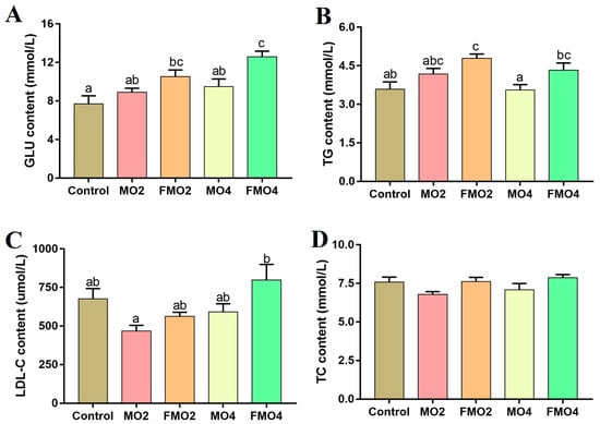 The plasma biochemical indices are illustrated in Figure 1. The FMO2 and FMO4 groups exhibited significantly higher GLU levels compared to the control group (p < 0.05). A further noticeable increase in GLU content was observed in the FMO4 group compared to the MO2 and MO4 groups (p < 0.05). The TG content was significantly increased in the FMO2 group versus the control group (p < 0.05). Moreover, a distinct increment in TG content was observed in the FMO2 and FMO4 groups relative to the MO4 group (p < 0.05). Furthermore, the content of LDL-C was significantly increased in the FMO4 group relative to the MO2 group (p < 0.05).