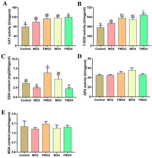 Effects of dietary MO and FMO on hepatic CAT: catalase (A); T-SOD: total superoxide dismutase (B); GSH: glutathione (C); GPX: glutathione peroxidase (D); and MDA: malondialdehyde (E) levels. Values with different alphabetical superscripts above bars are significantly different (p < 0.05, Tukey’s test).