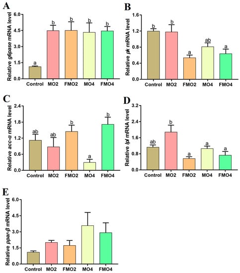Effects of dietary MO and FMO on hepatic g6pase: glucose-6-phosphatase (A); pk: pyruvate kinase (B); acc-α: acetyl-CoA carboxylase α (C); lpl: lipoprotein lipase (D); and ppar-β: peroxisome proliferator activated receptor-β (E) expression levels. Values with different alphabetical superscripts above bars are significantly different (p < 0.05, Tukey’s test).