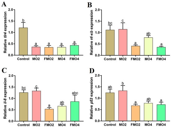 Effects of dietary MO and FMO on hepatic tlr4: toll-like receptor 4 (A); nf-κb: nuclear factor-kappa B (B); il-8: interleukin 8 (C); and p53 (D) expression levels. Values with different alphabetical superscripts above bars are significantly different (p < 0.05, Tukey’s test).