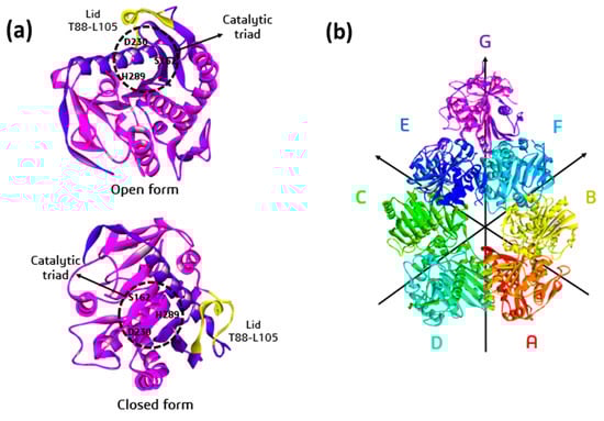 (a) Ribbon representation of the structure of lipase lip2 from Y. lipolytica showing the open and closed form of LID (T88-L105) and indicating the catalytic triad of this enzyme, formed by S162, D230, and H289. (b) Packing of the asymmetric units that form the macromolecule, corresponding to the A–G units, highlighting an orientation plane for better visualization of these units that form the enzymatic complex.