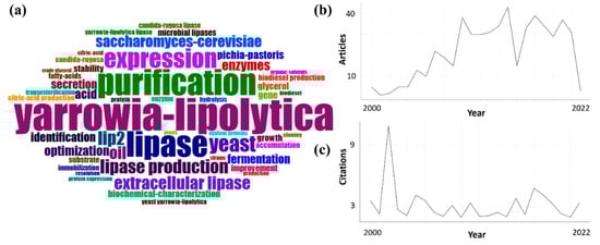 (a) Map of keywords related to Y. lipolytica between 2000 and 2022. (b) The number of articles related to Y. lipolytica. (c) The number of citations related to Y. lipolytica.