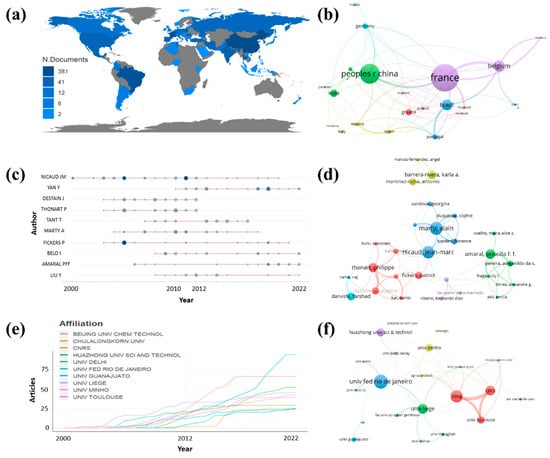 Data were obtained between 2000 and 2022 with the keywords Y. lipolytica and lipase. (a) Several documents were published by each country and obtained by bibliometrics. (b) Co-authorship between countries in the publication, using a minimum of 5 articles per country, obtained by VOSviewer. (c) Production of authors over time, obtained by bibliometrics. (d) Co-authorship between the authors in the publication, using at least 5 articles per author, obtained by VOSviewer. (e) Production of affiliations over time, obtained by the bibliometrics. (f) Co-authorship between affiliations, using a minimum of 5 articles per affiliation, obtained by VOSviewer.