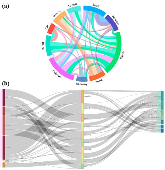 Figure 3a shows the publications of the countries of the globe in the related area. The bibliometrics showed that the countries that published the most were China, France, and Brazil, with 381, 236, and 213 publications, respectively. It is interesting to observe that Belgium, the country that appeared in fourth place in the number of publications, presented 90 publications, less than half of the country in third place. It was found that the first three countries mastered the theme in the analyzed period. Figure 3b shows co-authorship and research correlations between countries, forming well-defined clusters with different colors. China cooperates with India (73 articles) and has a robust connection with France. France has strong cooperation with Belgium, and Brazil has strong cooperation with Portugal (55 articles).