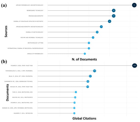 Figure 5 shows the journals that published the most from 2000 to 2022 and the articles with the highest number of citations, both obtained by the bibliometrics. Figure 5a shows the journals with the most articles. Applied Microbiology and Biotechnology, Bioresource Technology, and Process Biochemistry had the highest number of articles, with 21, 16, and 16, respectively. Figure 5b shows the articles with the most citations. The article entitled “Hydrophobic substrate utilization by the yeast Y. lipolytica, and its potential applications”, published by Fickers P. in 2005 in the journal FEMS Yeast Research, obtained the highest number of citations in the period []. With 436 citations, the article reports that the alkane-assimilating yeast Y. lipolytica very efficiently degrades hydrophobic substrates such as n-alkanes, fatty acids, fats, and oils for which it has specific metabolic pathways. Oxidative degradation to alkanes and triglycerides in Y. lipolytica is provided, with new insights arising from recent genome sequencing of this yeast []. The second article that obtained the highest number of citations was entitled “Y. lipolytica as a potential producer of citric acid from raw glycerol” and was published by Papanikolaou S. in 2002 in the Journal of Applied Microbiology, where it obtained a total of 256 citations []. The article studies the biochemical response of Y. lipolytica LGAM S(7)1 during growth in crude glycerol (the main by-product of biodiesel production plants) to produce metabolic products of industrial importance []. The third article with the highest number of citations was published by Bilal M. in 2018 in the International Journal of Biological Macromolecules, totaling 237 citations. The article “Magnetic nanoparticles as versatile carriers for enzymes immobilization: A review” comprehensively reviews the supportability of immobilizing enzymes where Y. lipolytica is present [].