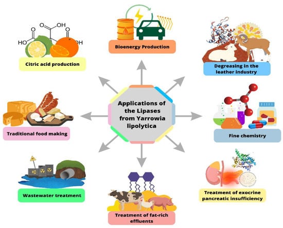 It is verified that the use of Y. lipolytica in the biotechnology area has good future perspectives, with significant growth of applications in several areas, especially enzymatic engineering for improvements in industrial processes. In the area of industrial waste management, this yeast has also been applied, and this is due to the commitment to paper in different conditions to which it is subjected since it can also be applied in a wide range of pHs and at different temperatures, depending on the conditions under which they were obtained and cultivated. The function of yeast Y. lipolytica in environmental applications becomes increasingly necessary because it presents excellent environmental benefits, reducing the risks caused by pollution from various industrial applications. Figure 6 below is a diagram of the main applications of the lipases from Y. lipolytica.