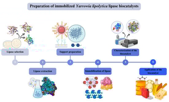 The immobilization of Y. lipolytica lipase is a widely used strategy to produce biocatalysts with high stability and reuse capability, in addition to allowing their application in different industrial processes [,]. Below are the main steps for preparing immobilized lipase from Y. lipolytica biocatalysts, as shown in Figure 7.