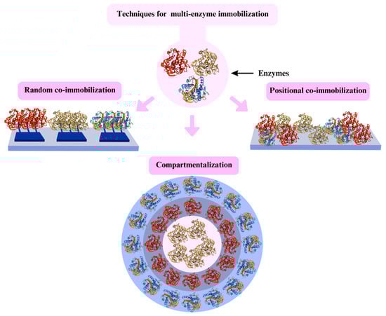 Using co-immobilized enzymes creates a multi-enzyme biocatalyst design, producing several kinetic advantages making chemoenzymatic cascade reactions [,]. A cascade reaction is when the product of enzyme one serves as enzyme-substrate two and involves multiple sequentially active enzymes in a synthetic pathway [,]. Its main advantage is to reduce the reaction delay time; however, this can be critical when the product of the first enzyme is unstable [,]. In this sense, co-immobilizing enzymes can generate several technological problems, making them require careful economic analysis to be advantageous []. Figure 9 presents some multienzyme immobilization techniques.