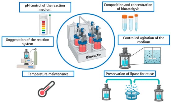 Characterization of the biocatalyst: The immobilized biocatalyst must be characterized to determine its activity, stability, and reuse capability under different pHs, temperatures, and organic solvents [,]. Spectrophotometric or titrimetric methods can measure enzyme activity, while stability and reuse capability can be assessed through long-term assays [,,,,,].