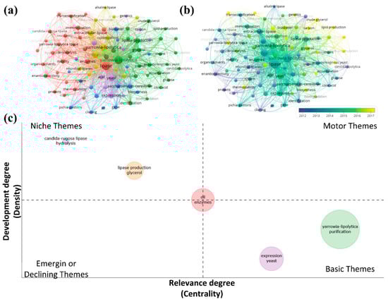 Figure 3 shows a bibliometric review of Y. lipolytica, which shows data obtained from the Web of Science Core Collection platform with a database of 524 articles related to Y. lipolytica (keywords: Y. lipolytica and Lipase, analysis period from 2000 to 2022). The software used for analysis was the free software R Studio with the extension “bibliometrix::biblioshiny()” and the software VOSviewer version 1.6.18 [,].