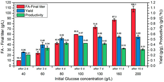 With increasing initial glucose concentration, more product is formed, and with 200 g/L glucose, the highest final concentration of 108.1 g/L FA was achieved in this set of experiments (Figure 1). However, this tendency could not be confirmed in terms of yield and productivity. Rather, with regard to these two process parameters, an optimum range of 80–130 g/L initial glucose was identified. Thus, the cultivation approach with 100 g/L glucose showed the highest yield (0.57 g/g). At initial glucose concentrations higher than 100 g/L, however, only a minimally lower yield of 0.55 g/g was detected. With regard to the achieved productivities, the highest productivities were detected in the range of 80–130 g/L glucose, with 0.43 and 0.42 g/(L∙h), respectively. A further increase in the initial glucose concentration leads to lower productivities. This showed that FA concentrations above 100 g/L are possible, but that a fed-batch strategy should be investigated.
