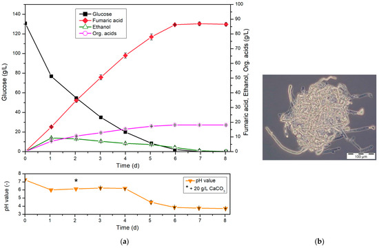 (a) Cultivation of R. arrhizus NRRL 1526 with 10 % (v/v) pre-culture and optimized medium B in 500 mL shake flasks without baffles at 34 °C and 200 rpm, and 50 g/L CaCO3 with addition of 20 g/L CaCO3 after 2 d (left). (b) Morphology of R. arrhizus NRRL 1526 using pre-culture after 3 d (right).
