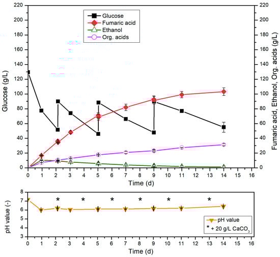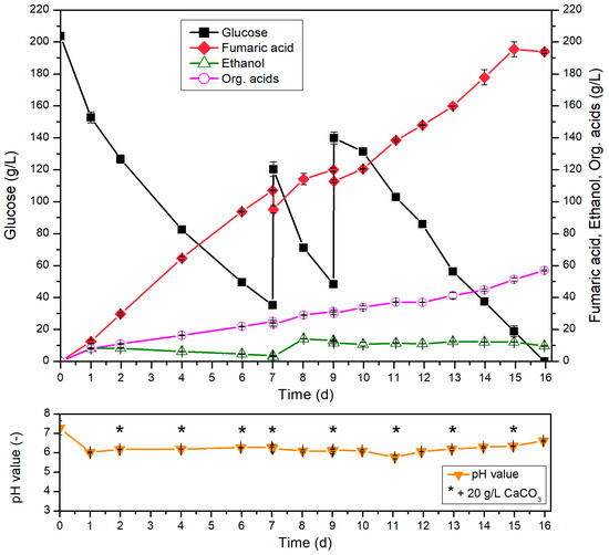 The absolute amount of glucose to be converted into FA was increased during cultivation by adding glucose several times. Glucose was added in the form of solids and in an amount leading to an additional 40 g/L in the cultivation medium (Figure 4). The regular addition of calcium carbonate also prevented a drop in pH throughout the cultivation process.