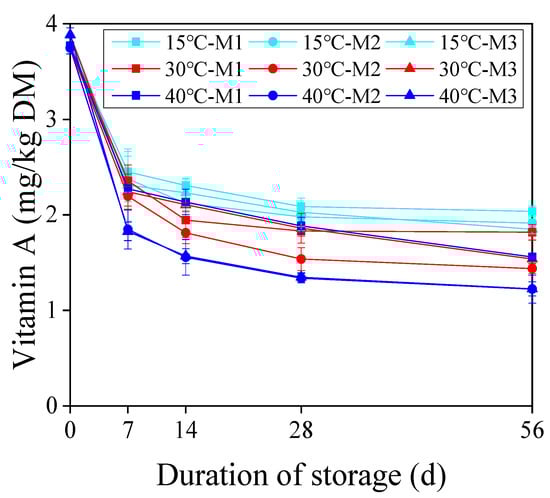 In the present study, it can be observed that different moisture level and temperature have significant effects on the loss of vitamin A in TMR silage. Under the moisture levels of M2 and M3, the vitamin A loss of the TMR increased significantly with the increase of temperature, which indicated that high temperature was not conducive to the preservation of vitamin A. However, there was no significant difference in vitamin A loss between 30 °C and 40 °C in TMR at an M1 moisture level, but both were higher than 15 °C. In addition, at the same temperature, the loss of vitamin A in M2 and M3 was significantly higher than that in M1. This indicates that the moisture level has a great influence on the loss of vitamin A.