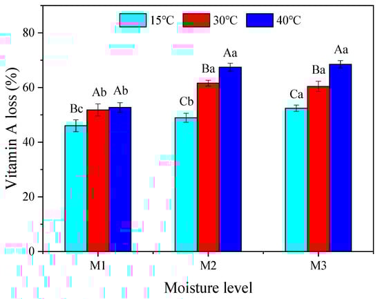 Vitamin A loss with the temperature at different moisture levels. M1, 450 g/kg; M2, 525 g/kg; M3, 600 g/kg. Lowercase letters represent the level of significant difference between samples stored at different moisture levels for the same temperature (p < 0.05). Capital letters represent the level of significant difference between samples stored at the same moisture levels for different temperatures (p < 0.05). (n = 3, bars indicate the standard error of the means).
