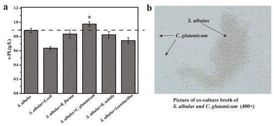 In this study, we selected five different strains for co-culture with S. albulus IFO 14147. After the seed solution was prepared, five different strains were inoculated with S. albulus into a 250 mL shake flask with 50 mL fermentation medium by inoculum of 8%, then cultivated at 30 °C in a rotary shaker with 200 rpm for 72 h. The production of ε-PL was determined after the fermentation and shown in Figure 1a. Compared to the single strain fermentation of S. albulus (0.886 g/L), the production of ε-PL showed an increase only in the co-culture of S. albulus with C. glutamicum group ((0.976 g/L) by 14.02% (p < 0.05). We speculate that the other four strains may have developed competitive relationships when co-cultured with S. albulus, or may have metabolized certain products that inhibit the synthesis of ε-PL by S. albulus. Therefore, C. glutamicum CICC 10064 was selected to co-culture with S. albulus IFO 14147 to increase the production of ε-PL. Figure 1b shows that these two strains could coexist in the fermentation broth (C. glutamicum is short rod-shaped and S. albulus is a spherical mycelium), which indicates that the metabolites produced by strains will not inhibit or damage them.