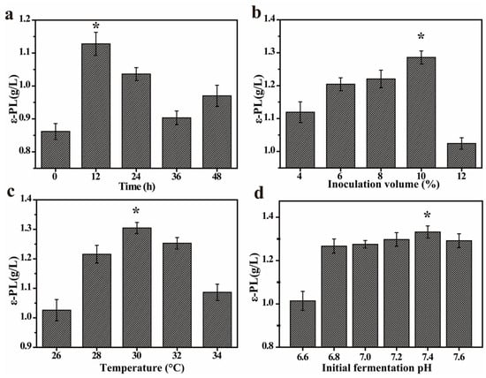 Optimization of fermentation conditions of co-culture for improving the production of ε-PL in flask cultivation level: (a) inoculation time of C. glutamicum, (b) inoculation volume of C. glutamicum, (c) different fermentation temperature, (d) different initial pH. (* represent p < 0.05).
