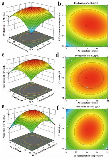 Three-dimensional plots and corresponding contour plots of the three variables on the response (production of ε-PL(g/L)) of the second-order polynomial function model. ((a,b) effect of inoculum volume and fermentation temperature; (c,d) effect of inoculum volume and initial pH; (e,f) effect of initial pH and fermentation temperature).