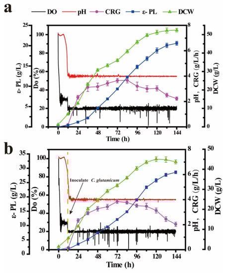 Following optimization of the fermentation parameters, a novel co-culture fermentation strategy was developed and performed in a 2-L jar fermenter; fed-batch fermentation of single S. albulus was also carried out as control group (Figure 4a). As shown in Figure 4b (experimental group), C. glutamicum was inoculated into the fermentor 12 h after the start of fermentation and co-culture with S. albulus. The DO level remained at 30% before the pH was reduced to 4.0, and then remained at 20% (pH reached 4.0) until the end of fermentation. When the glucose concentration in the fermentation broth was below 10 g/L, the sterilized glucose (90%, w/v) was automatically added and maintained at about 10 g/L, and the consumption rate of glucose (CRG) in the experimental group was higher than that in the control group after 72 h of fermentation. In the experimental group, ε-PL steadily accumulated in the culture broth from the start of fed-batch fermentation, and finally reached 27.07 ± 0.47 g/L by 144 h. However, the DCW in the experimental group was only 43.84 ± 0.98 g/L, showing a decrease compared to that in the control group. This means that more glucose was used to synthesize ε-PL, i.e., the ability of bacteria to synthesize ε-PL had been improved.