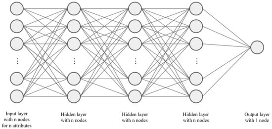 This research employed a feedforward neural network implemented using the popular deep learning library TensorFlow []. The training process involved dividing the data set into training and testing subsets, with the former being used to adjust the network’s weights and biases, whereas the latter was used to assess the model’s performance on previously unseen data. The selection of the appropriate architecture, activation functions, and optimization algorithm played a pivotal role in achieving optimal classification accuracy for the given problem.