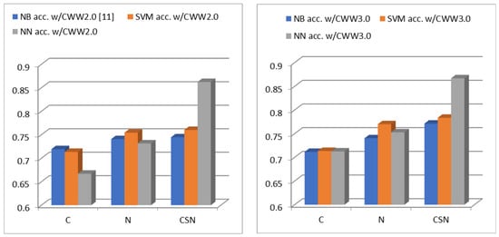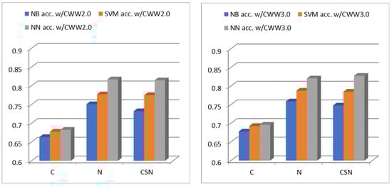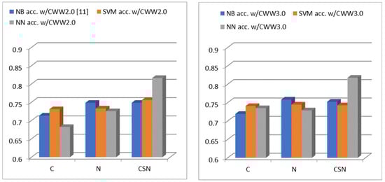 For the dataset2, the big data set, Figure 4 shows the accuracy comparison between the naïve Bayes, SVM, and neural networks techniques applied on Robert Parker’s review. On the left is the result from Robert Parker’s reviews processed by the CWW2.0, and on the right is the result from Robert Parker’s reviews processed by the CWW3.0. On the x-axis, C, N, and CSN indicate the attribute selection of category attributes, normalized attributes, and all attributes (normalized, categorical, and subcategory attributes), respectively.