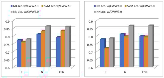 For dataset2, the big data set, Figure 5 shows the accuracy comparison between the naïve Bayes, SVM, and neural networks techniques applied to Wine Spectator’s reviews. On the left is the result from Wine Spectator’s reviews processed by the CWW2.0, and on the right is the result from Wine Spectator’s reviews processed by the CWW3.0. On the x-axis, C, N, and CSN indicate the attribute selection of category attributes, normalized attributes, and all attributes (normalized, categorical, and subcategory attributes), respectively.