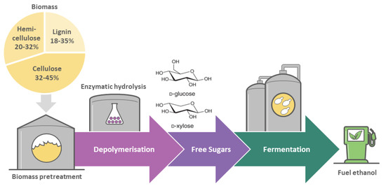 It is obvious that sustainable alternative approaches to the generation of liquid transport fuels are required moving forwards. Here, second-, third-, and fourth-generation bioethanol will become increasingly important. These processes rely on non-food sources as substrates. Second-generation (2G) ethanol is derived from non-food biomass such as dedicated energy crops (e.g., Miscanthus, switchgrass, short rotation coppice, and other lignocellulosic plants), agricultural residues, forest residues, and other waste materials (e.g., corn stover, wheat straw, and sugarcane bagasse). Plant biomass is primarily composed of sugar-rich polymers cellulose and hemicellulose and the phenolic-based lignin [17,18]. Cellulose is a homopolymer of glucose and exists mainly in a highly ordered crystalline form. Hemicellulose is a partially acetylated heteropolymer consisting of five-carbon sugars (xylose and arabinose), six-carbon sugars (galactose, mannose, and glucose), and sugar acids. Xylose is the major hemicellulose component of agricultural residues such as bagasse, corn stover, straw, energy grasses, and hardwoods. Softwoods have a higher proportion of six-carbon sugars such as galactose and mannose. Lignin is a heteropolymer of phenylpropane monomers linked in various ways [19]. In general, lignocellulosic bioethanol from agricultural and forest residues has a greater potential to reduce GHG emissions than bioethanol from energy crops such as Miscanthus and switchgrass [15]. Whatever the source of biomass, it must first be depolymerized into its component sugars. This is achieved by various means of pretreatment to make the cellulose and hemicellulose polymers susceptible to enzymatic hydrolysis. The potential range of lignocellulosic biomass is vast and the methods for its depolymerization are varied, as recently reviewed by others [20,21,22]. The conventional model for producing 2G ethanol is discussed in Section 2. Whereas 1G and 2G ethanol rely on plant biomass, third-generation (3G) bioethanol aims to utilize algal biomass as feedstock. Here, micro- or macroalgae capture CO2 by photosynthesis and are subsequently used as a source of carbohydrates for ethanolic fermentation [23,24]. Whilst laboratory and pilot scale works show promise for 3G ethanol, the commercial production of biofuels by algae faces many economic and technical bottlenecks, including investment costs, insufficient yields and productivities, high energy input for harvesting, and risks of contamination in open pond systems [25]. The concept of fourth-generation (4G) biofuels is to use synthetic biology to modify algae, cyanobacteria, and other microbes to produce photobiological biofuels and high-value chemicals. It combines photovoltaics and microbial fuel production by synthetic cell factories or synthetic organelles [26]. Although still in its infancy, 4G ethanol is an exciting prospect, suggesting a promising route to GHG negativity in transport fuel generation. For now, 1G and 2G ethanol are the primary sources of this biofuel, with 1G ethanol being the major contributor representing about 94% of total bioethanol produced.