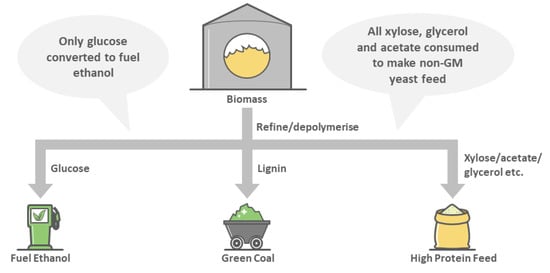 Here, we propose a process that uses renewable energy to drive the coproduction of fuel in the form of bioethanol from cellulose, food in the form of yeast biomass that is high in protein, and sequestered carbon in solid form that can be stored or used as a “green coal” (Figure 2). Not only does this approach provide better economics but it also addresses the environment, food, and energy trilemma. Others have demonstrated the ability of lignin materials to function in comparison with metallurgical coal in the steel-making process, thus indicating the potential for green coal as a feedstock for that industry [35]. In fact, lignin and its derivatives have significant potential in sustainable construction, allowing the partial replacement of petroleum products in, for example, cement composites, rigid polyurethane foams, paints and coatings, phenolic or epoxy resins, and bitumen [36].
