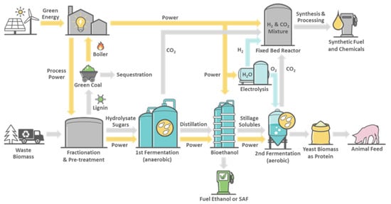 An integrated food, fuel, synthetic bio/chemicals, and carbon sequestering refinery. Renewable green energy is used to provide power for the biorefinery. Biomass is depolymerized using physicochemical and enzymatic processes to release sugars (mainly glucose from cellulose and xylose from hemicellulose). A first fermentation by yeast anaerobically converts cellulosic glucose into ethanol. Ethanol is distilled from the ferment and used directly as replacement for petrol or for generating synthetic aviation fuel (SAF). Stillage from the distillation is used as substrate for a second fermentation using a nonrecombinant yeast able to aerobically convert xylose, glycerol, and other organics into high protein-containing yeast biomass. Aerobiosis of this fermentation is supported by O2 obtained from electrolyzed water. The green H2 produced by electrolysis of water is combined with CO2 captured from the first and second fermentations to produce synthetic fuels or other carbon-based chemicals. Recalcitrant materials, including lignin and other solids, are dried and pelletized to provide a carbon-rich biomass that represents green coal. The green coal can be burned to provide extra power for processing, exported to the grid, used in other industrial applications such as steel manufacture, or can be sequestered as a carbon-rich solid. Yellow arrows represent power generation and flow; grey arrows represent carbon transformation and flow; blue arrows represent green H2 and O2 generation.