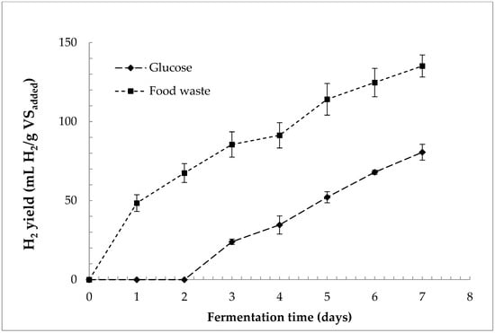 Mixed cultures obtained by the load shock pretreatment of anaerobic digested sludge were used as inoculum without the addition of nutrients and buffer in batch fermentation. Hydrogen yields of 135.2 ± 8.6 mL H2/VSadded and 80.6 ± 5.3 mL H2/VSadded were consequently obtained in the stationary phase of batch fermentation of food waste and glucose, respectively, at initial concentrations of 10 g VS/L (Figure 1). The hydrogen yield obtained from food waste is around 40% higher than that obtained from glucose. Hydrogen production rate and yield from food waste were higher than those from glucose during dark fermentation, indicating that food waste has an appropriate ratio of carbon and nitrogen, sufficient nutrients and buffer, which are favorable for microorganism growth and enhancing hydrogen production via dark fermentation, which is thermodynamically linked to butyric acid and acetic acid production as demonstrated in Equation (3), providing a theoretical yield of 373.57 mL H2/g VS: