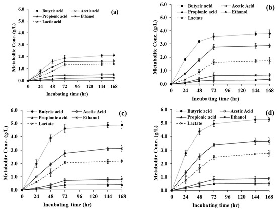 Metabolites from batch dark fermentation of food waste at various initial food waste concentrations (% w/v) of 5 (a), 8 (b), 10 (c), and 13 (d).