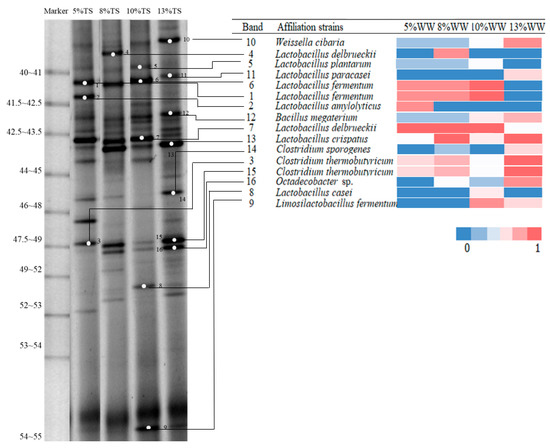 Sludge samples were taken from batch dark fermentation at 168 h with different initial concentrations of food waste. Total genomic DNA was extracted from 0.5 g sludge samples using TIAN amp Soil DNA Kit (TIANGEN Biotech (Beijing, China) Co., Ltd.). Extracted DNA was checked for quality by electrophoresis on a 1.0% agarose in 1X TAE buffer. 16S rRNA gene of bacteria was PCR-amplified using universal primer 1525r (5′ AAGGAGGTGWTCCARCC 3′) and 27f (5′ GAGTTTGATCCTTGGCTCAG 3′). The polymerase chain reaction (PCR) product was used as templates for amplification of the V3 region of 16S rRNA gene using primer 518r (5′ GTATTACCGCGGCTGCTGG 3′) and 357f (5′ CTCCTACGGGAGGCAGCAG 3′) with CG clamp (CGCCCGCCGCGCGCGGC-GGGCGGGGCGGGGGCACGGGG GG). The PCR products were stored at 4 °C and analyzed on 1.5% agarose before sequencing with denaturing gradient gel electrophoresis (DGGE). By using 8% polyacrylamide gel, the DGGE was constructed with linear urea-formamide gradients of denaturant ranging from 40% to 70% in 0.5 × TAE buffer at a constant temperature of 60 °C (DGGE unit, V20-HCDC, Scie-Plas Limited, Cambridge, England). DGGE gel was performed by electrophoresis at 20 V for 20 min, followed by 70 V for 16 h, Sybr Gold-stained, and visualized on a UV transilluminator. Most of the DGGE bands were excised from the polyacrylamide gel and sequenced by Macrogen Inc. (Seoul, Republic of Korea). The closest matches for partial 16S rRNA gene sequences were identified by a database search in Gene Bank using BLAST [23].
