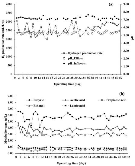 During the first 4-day start-up period, hydrogen composition in the fermented gas of 5, 11, 25, and 36 (% v/v) was detected on day 1, day 2, day 3, and 4, respectively. Food waste with 26.4 g VS/L was fed to the CSTR at a designed HRT of 4 days, corresponding to an organic loading rate (OLR) of 7.6 g VS/L d under a 55 °C thermophilic temperature. The appropriate HRT between 2 days and 6 days is usually selected to evaluate the optimum performance of the continuous dark fermentation of an organic waste in the CSTR [39]. Since they have a slow growth rate, methanogens normally require an HRT longer than 10 days for the traditional anaerobic digestion of organic wastes under a 55 °C thermophilic temperature in the CSTR [18]. Methane was not detected during the continuous operation for 51 days, indicating that methanogenic archaea were completely deactivated by operating with an HRT below 6 days and using an initial inoculum obtained by the load shock pretreatment of anaerobic sludge, leading to a high VFA concentration [14]. As demonstrated in Figure 4, catabolic metabolites including butyric acid, acetic acid, lactic acid, ethanol, propionic acid, and hydrogen were generated from food waste fermentation. The formation of such soluble metabolites must be the major cause for pH reduction in the fermentation system.