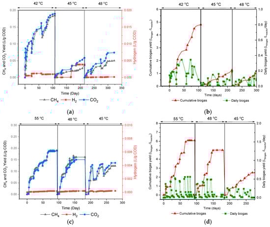 Biogas production in response to temperature shift conditions: (a) CH4, CO2, and H2 yield with (b) volumetric biogas yield in the upshifted temperature and (c) CH4, CO2, and H2 yield with (d) volumetric biogas yield in the downshifted temperature.